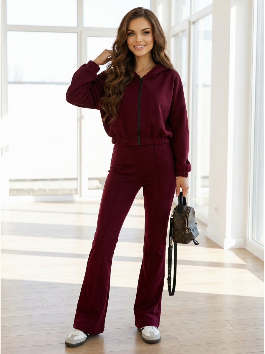 Ein locker sitzendes Sweatshirt und eine ausgestellte Hose mit Ziernähten ergeben ein stylisches, feminines Outfit – perfekt für jeden Tag.