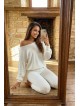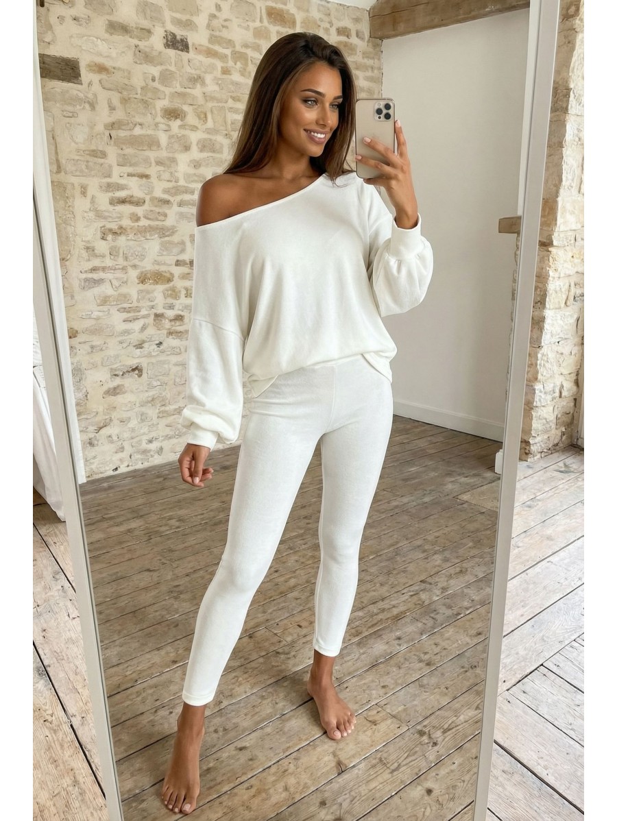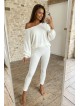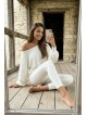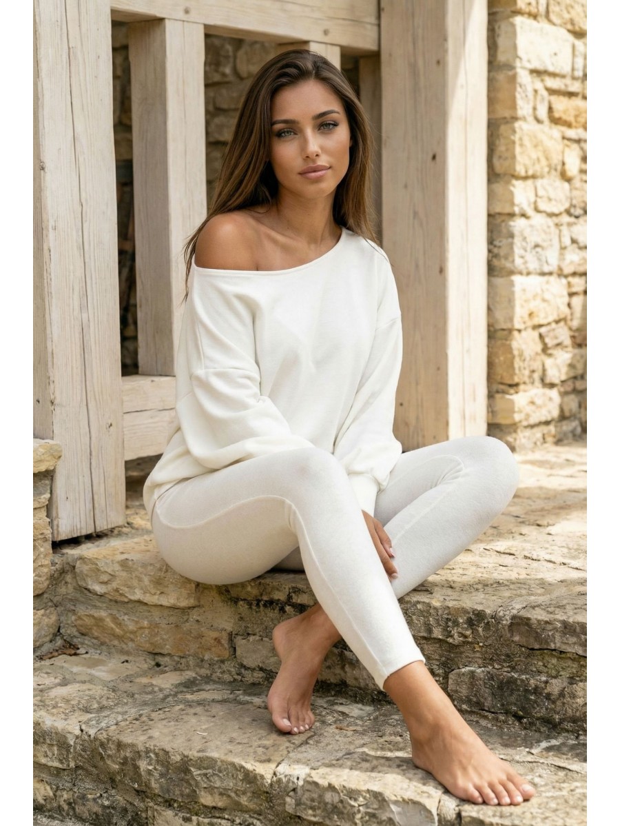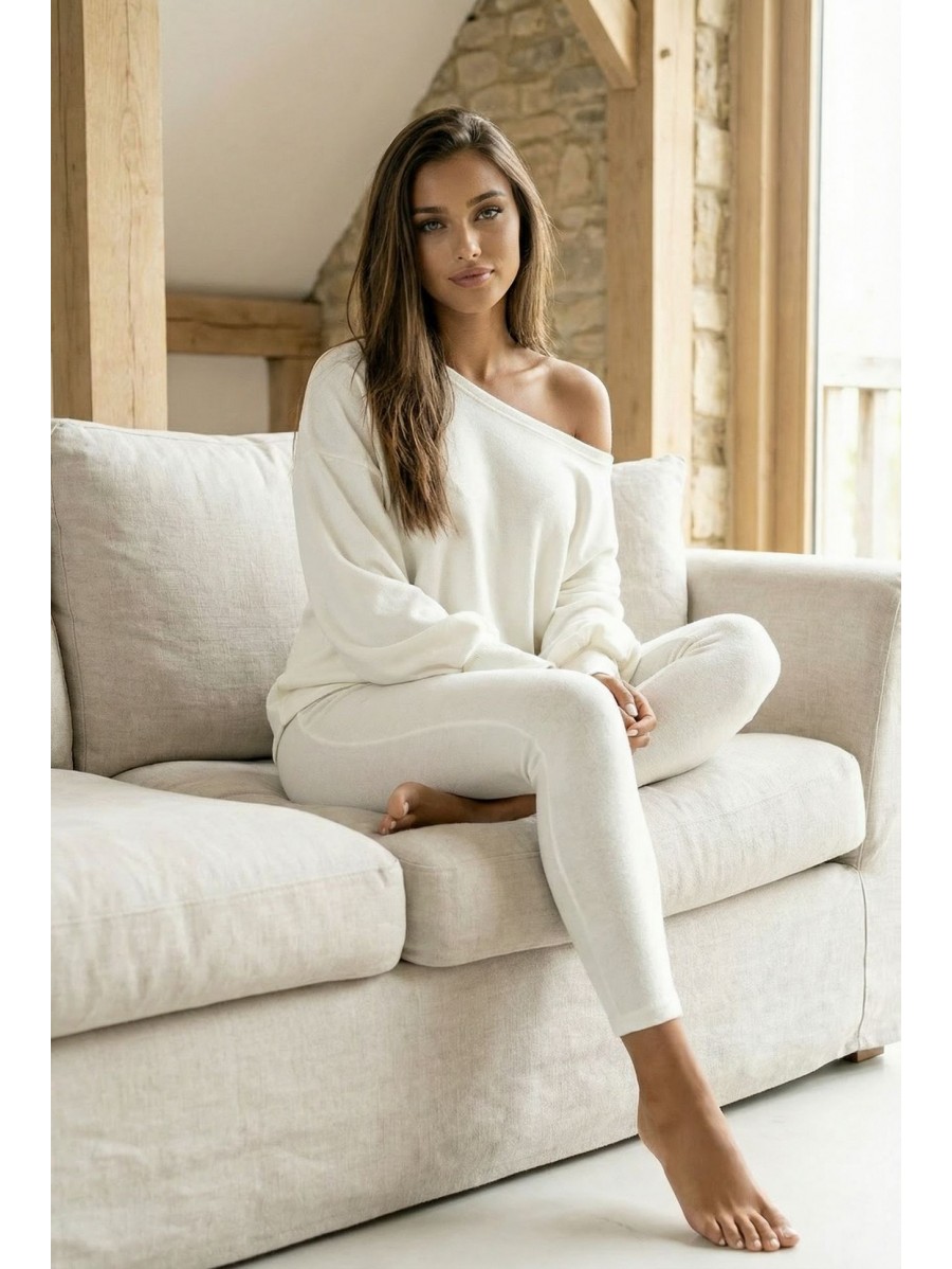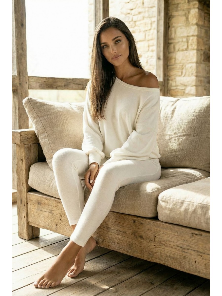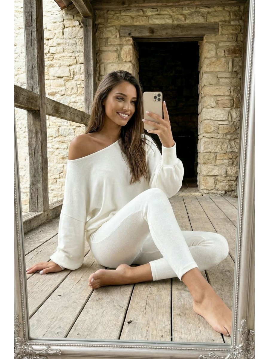 SOFT TOUCH K162 ist ein feminines Set aus elastischem Strick, bestehend aus einem locker geschnittenen Pullover mit überschnittener Schulter und figurbetonten Leggings.