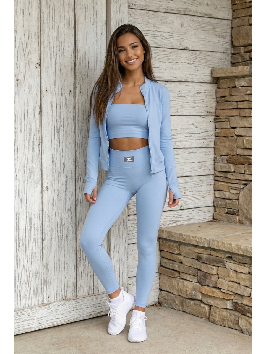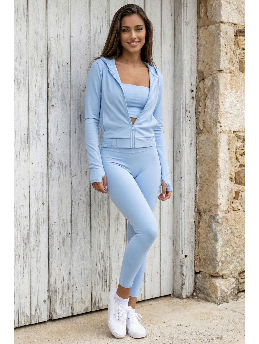 Im Set enthalten sind ein figurbetontes Top, Leggings und ein leichter Hoodie – drei Teile, die du zusammen oder einzeln tragen kannst und so viele Alltagslooks kreierst.